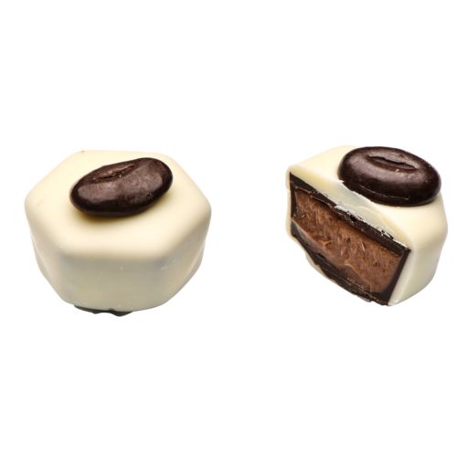 Dark chocolate filled with smooth, aromatic coffee and orange ganache, enrobed in white chocolate.