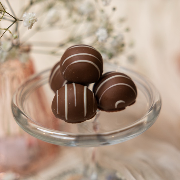 Milk chocolate champagne mousse in a milk chocolate truffle shell.
