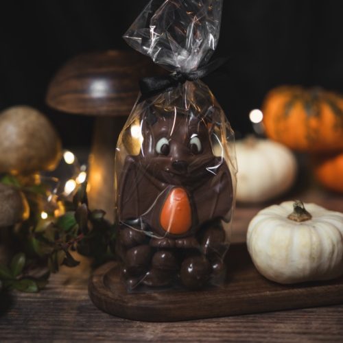 This super cute hollow milk chocolate Halloween bat is the perfect find for any trick or treaters who would prefer a real treat, and less of a trick! The chocolate bat sits on a bed of milk chocolate honeycomb. It is presented in a clear gift bag with matching black bow.