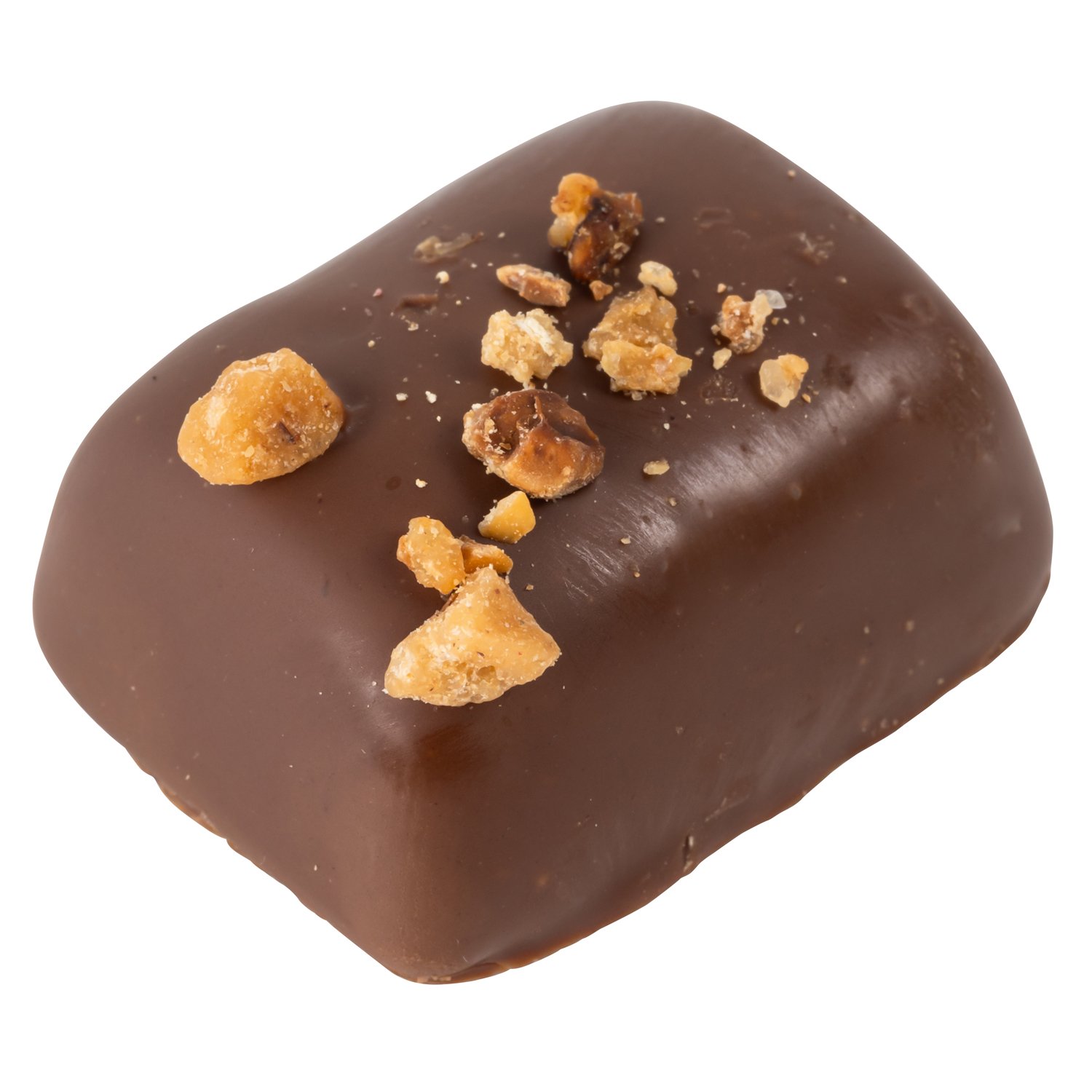 Smooth, sharp rhubarb crème centre, enrobed in sweet milk chocolate, topped with crunchy crushed hazelnuts.
