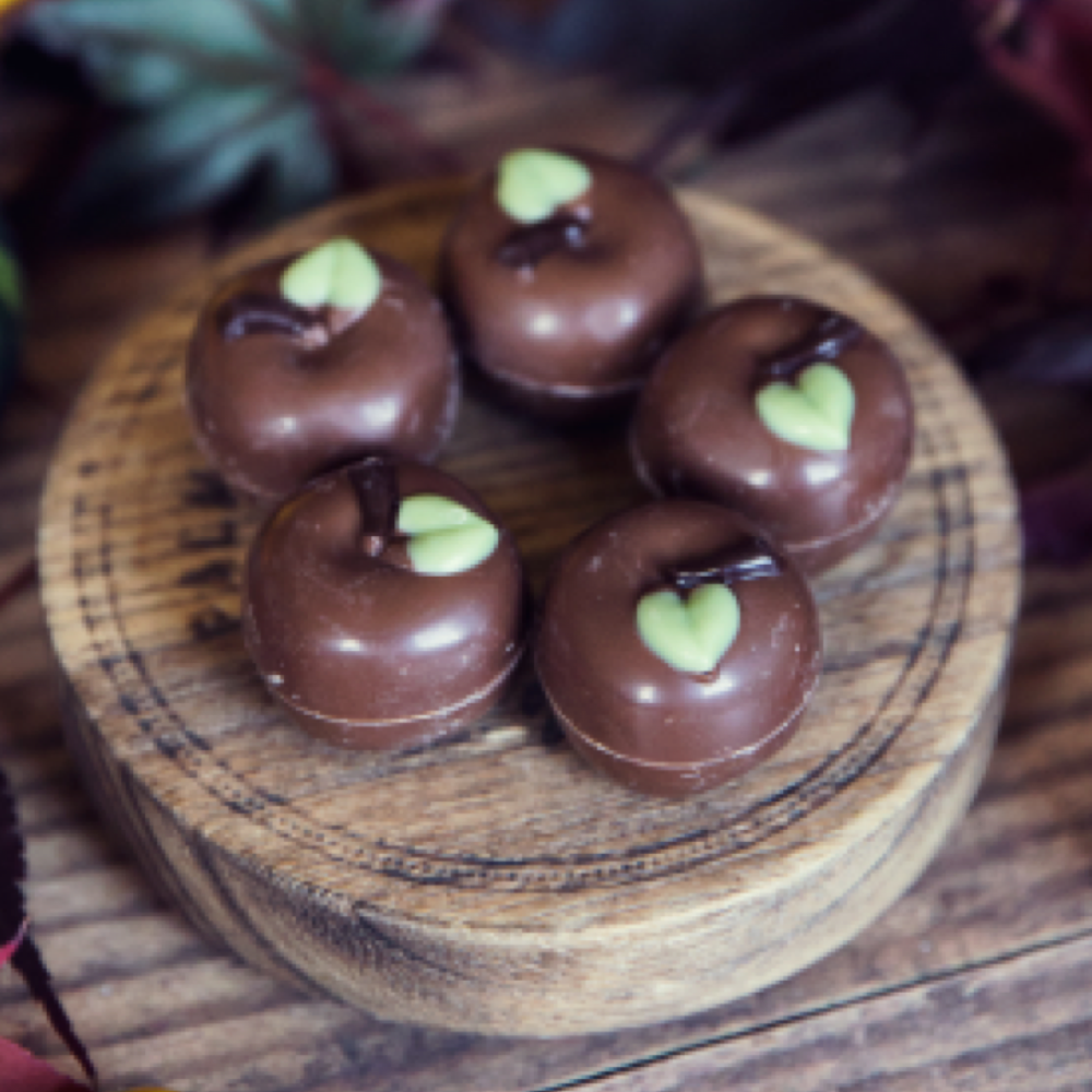 Milk chocolate apple shape filled with soft caramel, with decorated stalk and leaf detail. The toffee apple is a limited edition seasonal chocolate, so grab it while you can!