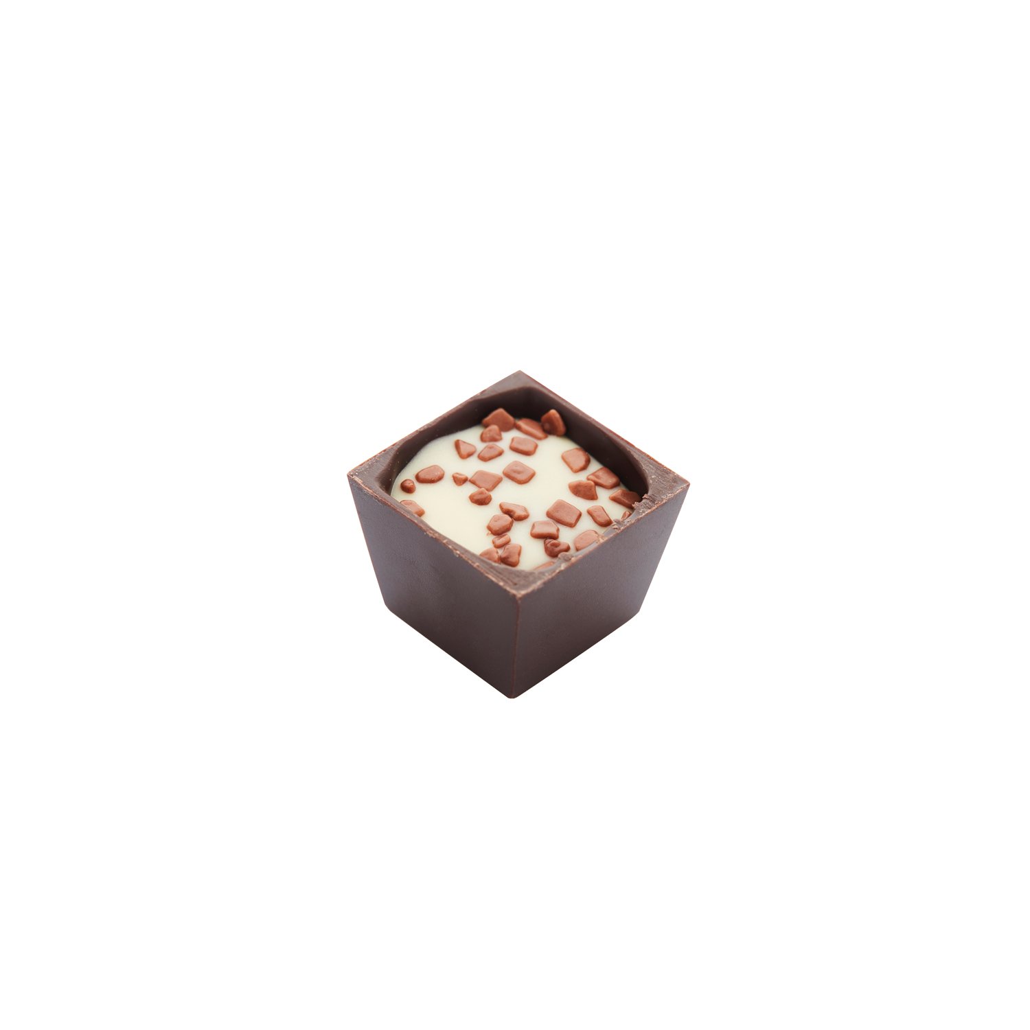 Dark chocolate cup filled with white chocolate brownie cream, topped with milk chocolate sprinkles.